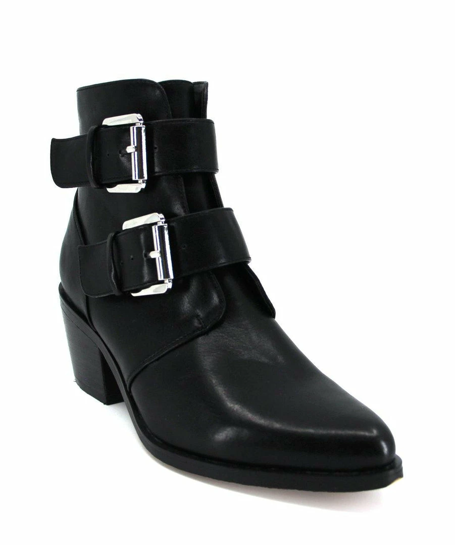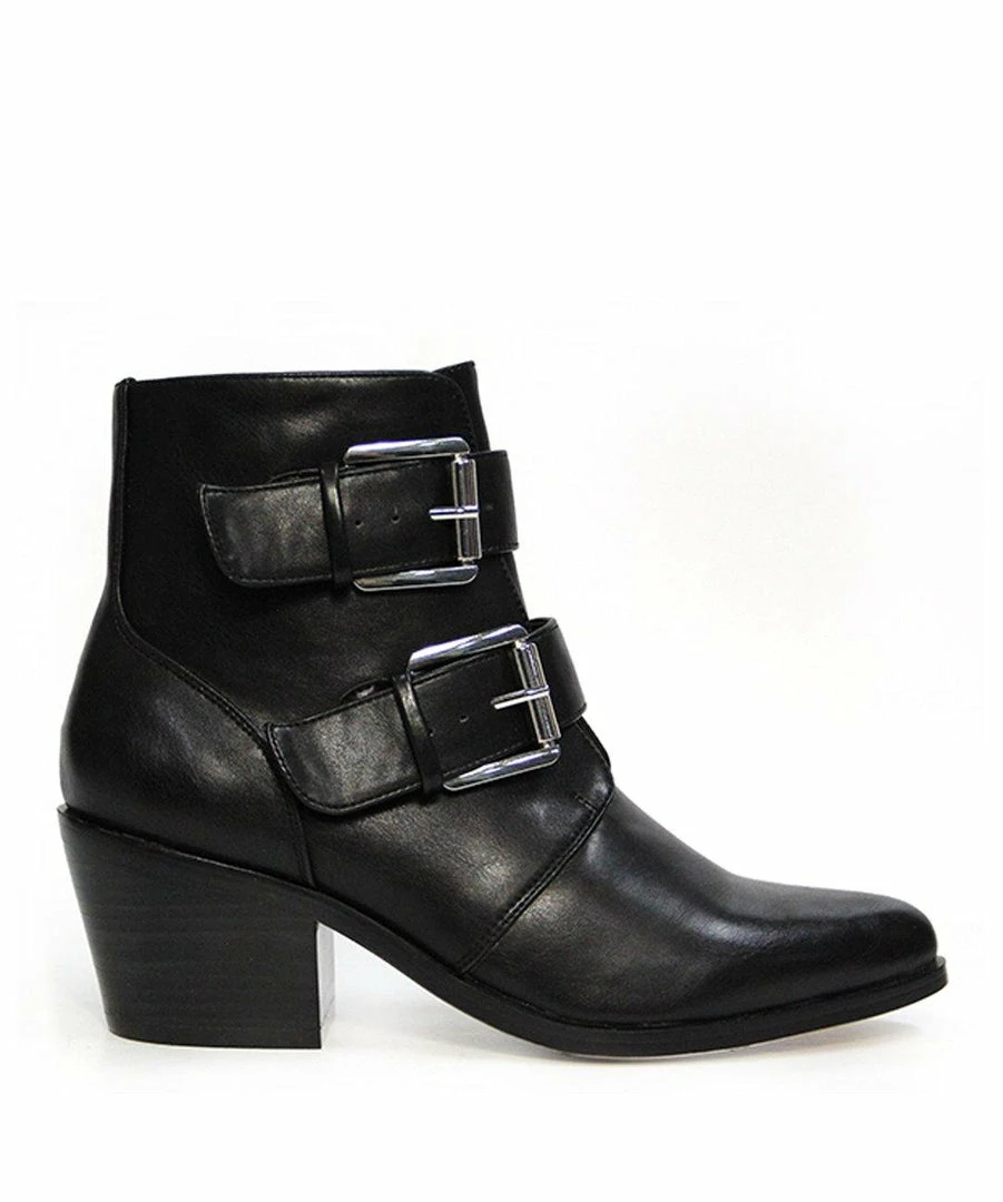Pointed toe heeled ankle boot with double buckle detail and side zip entry