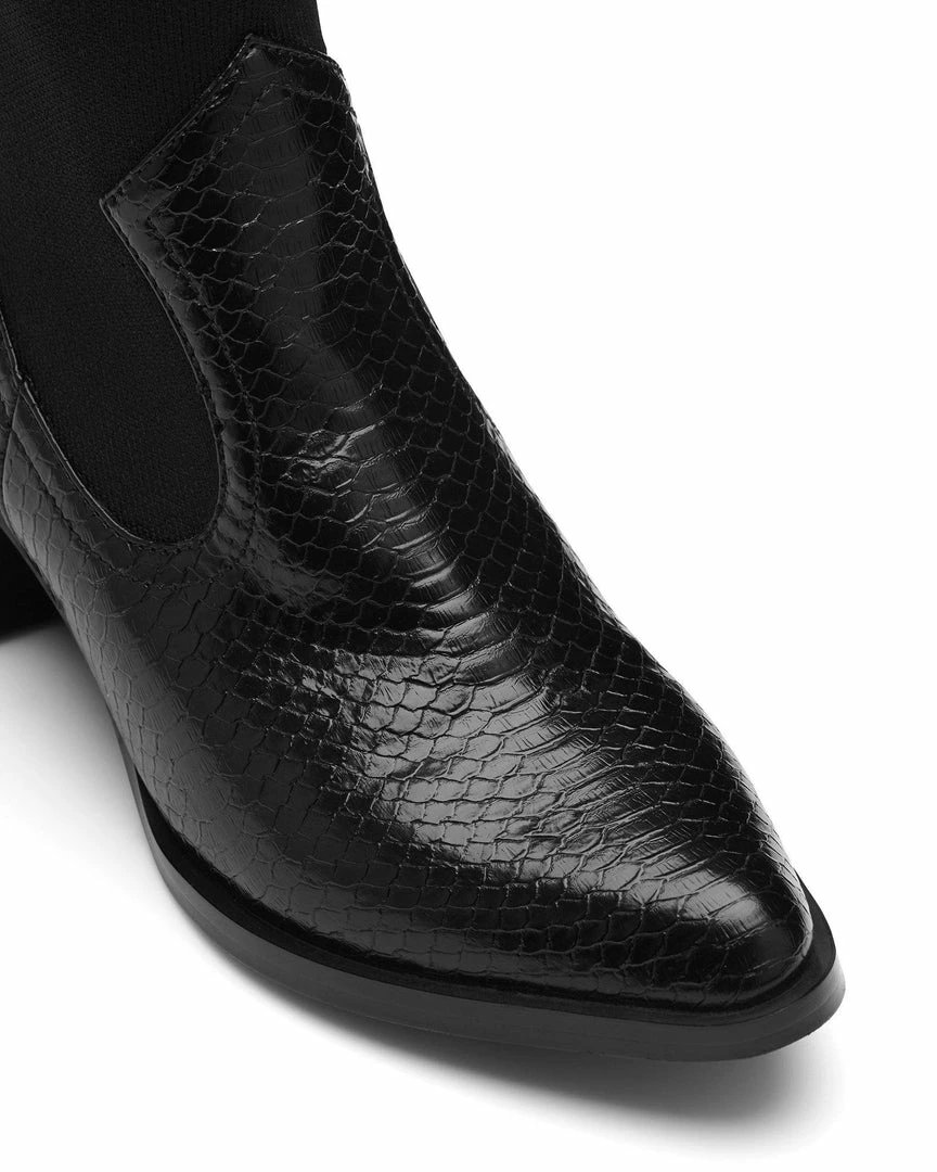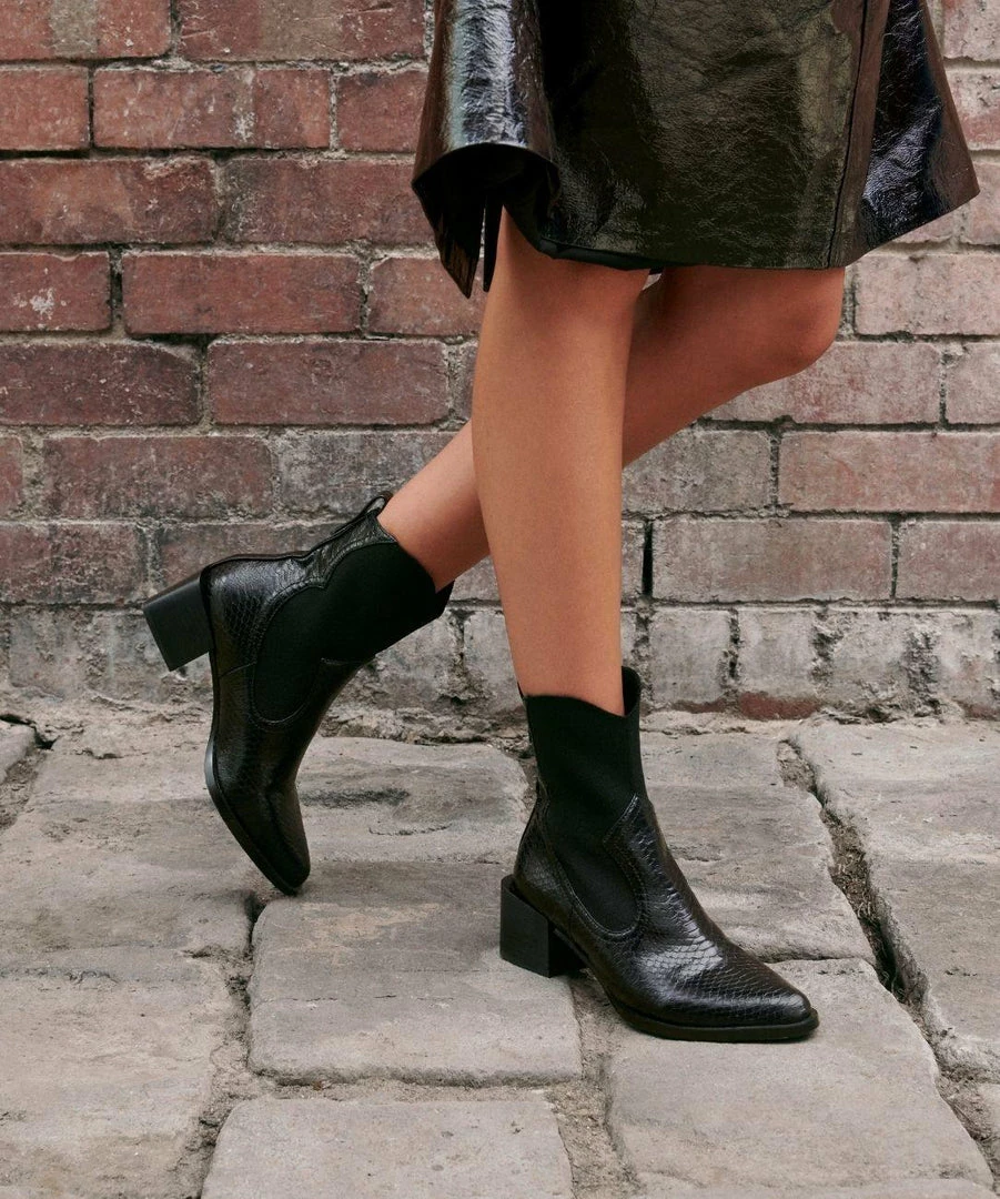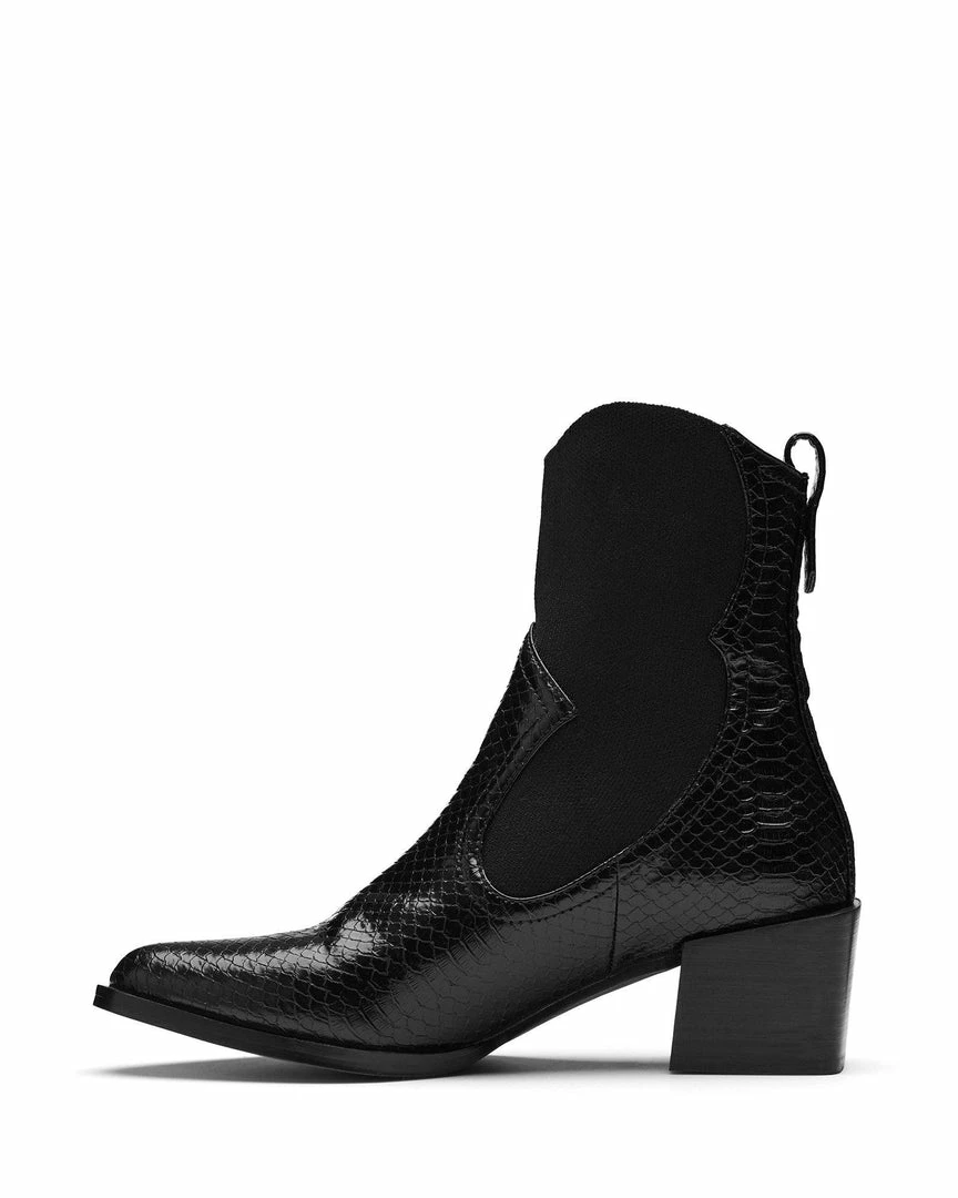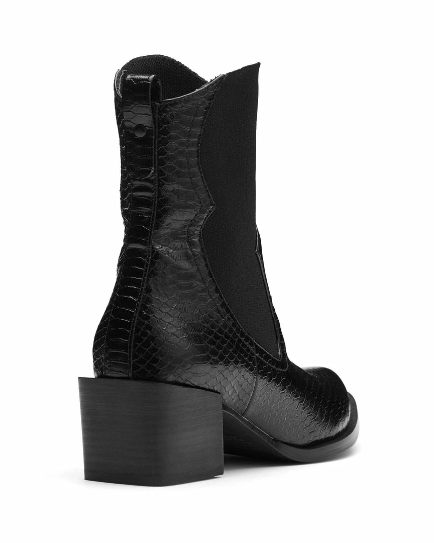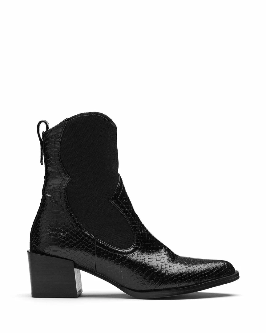 Maverick by Therapy will turn heads. Featuring a faux leather snake embossed upper and side elastic gusset on a low stacked leather heel. Rock these western statement boots this winter!