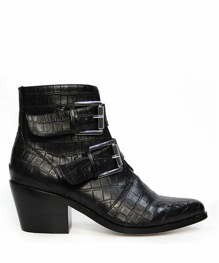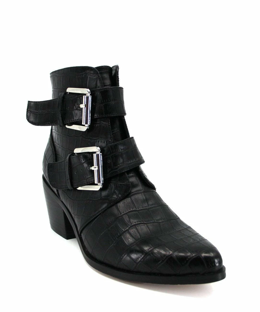 Pointed toe heeled ankle boot with double buckle detail and side zip entry