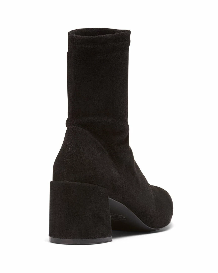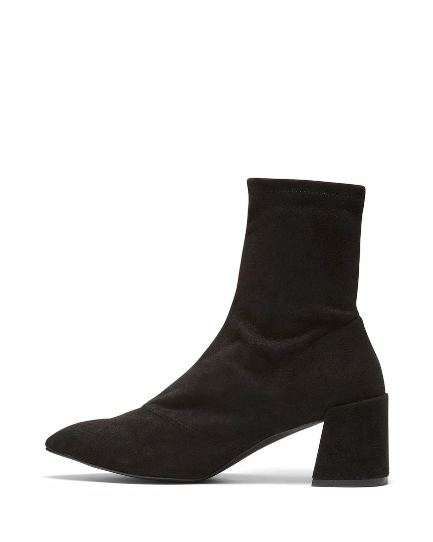 A pointed toe sock like ankle bootie with flare heel design